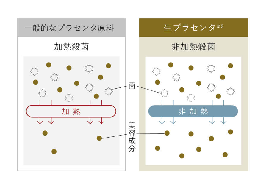 熱を一切加えずに殺菌する独自の製法で、細胞成長因子を多く残し、美容効果を最大限に発揮することのできる方法を採用しています。