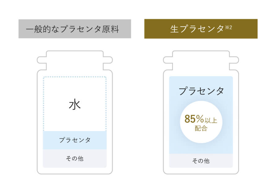 一般的なプラセンタエキスの抽出には水を使用するため、薄まってプラセンタ本体の効果を最大限に発揮できません。Stella Blancheに配合している生プラセンタ※2では一切水を使わずに、純度の高いエキスを抽出する独自の製法を開発しました。